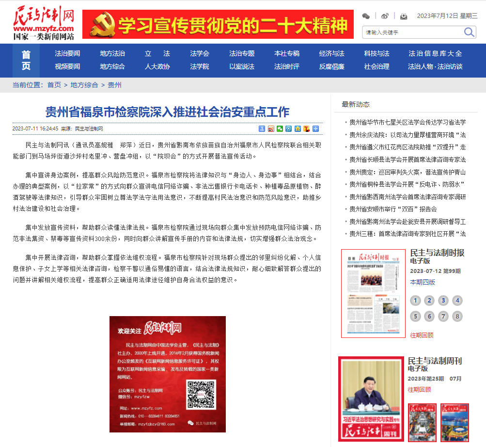 集中宣讲身边案例,提高群众风险防范意识。福泉市检察院将法律知识与“身边人、身边事”相结合,结合办理的典型案例,以“拉家常”的方式向群众宣讲电信网络诈骗、非法出售银行卡电话卡、种植毒品原植物、醉酒驾驶等法律知识,引导群众牢固树立尊法学法守法用法意识,不断提高村民法治意识和防范风险意识,助推乡村法治建设和社会治理。 集中发放宣传资料,帮助群众读懂法律法规。福泉市检察院通过现场向群众集中发放预防电信网络诈骗、防范非法集资、禁毒等宣传资料300余份,同时向群众讲解宣传手册的内容和法律法规,切实增强群众法治观念。 集中开展法律咨询,帮助群众掌握依法维权流程。福泉市检察院针对现场群众提出的邻里纠纷化解、个人信息保护、子女上学等相关法律咨询,检察干警以通俗易懂的语言,结合法律法规知识,耐心细致解答群众提出的问题并讲解相关维权流程,提高群众正确适用法律途径维护自身合法权益的意识。